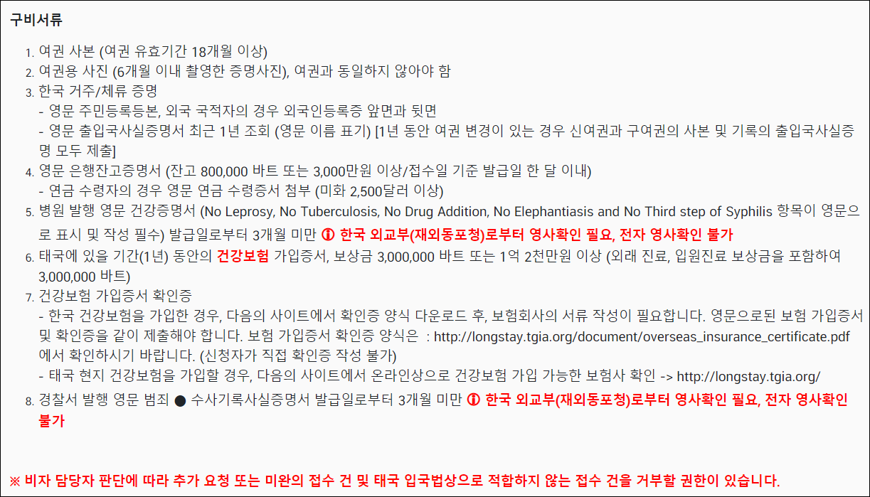 위와같이 Non-OA 비자는 최대 2년까지 태국 체류가 가능하며, 이는 아래의 구비서류 중 6번과 7번이 입국시마다 꼭 준비가 되어야 합니다.